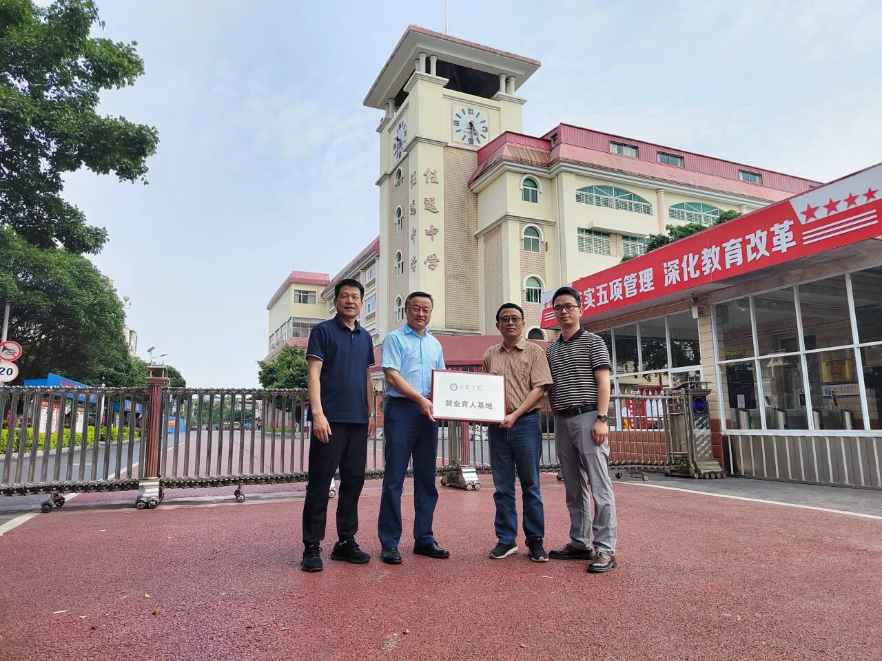 为了进一步深化与实习基地的合作,拓宽毕业生就业渠道,5月16日,人文学院院长莫其逊、党总支书记庞一飞赴桂林市任远中学举行“就业育人基地”授牌仪式。任远中学副校长杨少明、校长助理冯基接受授牌。