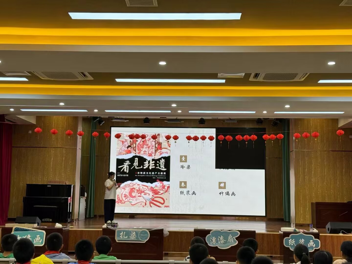 活动现场,竹编画的精巧、扎染的斑斓、漂漆扇的雅致、纸浆画的创意,四大非遗传统技艺悉数亮相,为师生们呈现了一场视觉与文化的盛宴。工艺美术专业的师生们精心策划,司淑娴通过生动的讲座与直观的操作演示,她谈到非遗传统手工艺的历史渊源、文化意义以及如何将非遗技艺的精髓融入现代生活,同时她将非遗技艺的精髓娓娓道来,让大埠中心校的小朋友们在轻松愉快的氛围中,不仅学习了非遗技艺的基本概念与独特价值,更亲身体验了这些古老艺术的魅力。