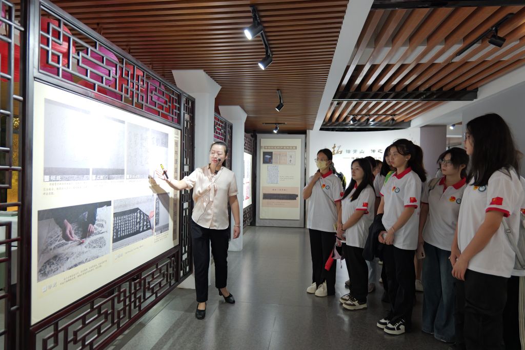 北有西安碑林,南有桂海碑林。桂海碑林始建于1963年,1984年成立博物馆,是全国重点文物保护单位。桂林石刻多以桂林山水为题材,这些铭刻于青山绿崖间的文辞,与自然景观构成了和谐互补的统一体,成为桂林山水人文景观的一大特色。进入场馆内,在讲解员的带领下同学们首先参观了解禊亭的“曲水流觞”石刻,感受那浩瀚如烟的历史;接着师生一行来到了位于龙隐岩的摩崖石刻,这些石刻以其深厚的文化内涵屹立在秀丽的桂林山水之中,讲解员对其中几幅极具特色的作品进行了解读和品鉴,同学们凝视着叹为观止的石刻雕塑,对古人精湛的技艺佩服不已,深刻地感受到了中华民族五千多年历史文化的丰富灿烂与博大精深;活动的最后一站来到了博物馆的室内收藏馆,在此处师生们欣赏了来自桂林各处山岩不同历史时期的重要石刻拓本,了解了拓片的形态、种类以及拓片制作的流程与方法。据了解,桂海碑林博物馆现为国家二级博物馆,负责古代桂林石刻的保护管理、研究展示、宣传教育和文化交流等工作,是广西唯一的石刻专题博物馆,也是广西爱国主义教育基地、桂林市党员干部廉政文化教育基地。