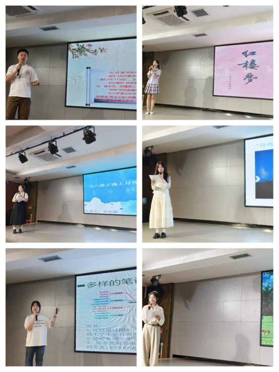 活动现场,主持人介绍了活动背景及“线上积分+线下展示”的评选规则,强调了共读活动对深化阅读体验、促进思想交流的意义。六位领读员依次上台展示,结合PPT讲解、诗词朗诵、短视频剪辑等形式,分享了各组共读成果。从《红楼梦》的人物命运剖析,到《我的阿勒泰》的边疆风情呈现,再到《月亮与六便士》的理想哲学思辨,领读员们以多元视角和专业表达,带领现场同学领略了经典著作的魅力。