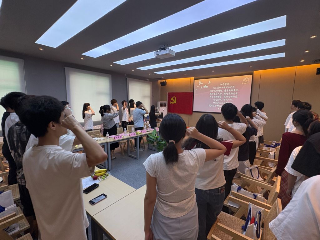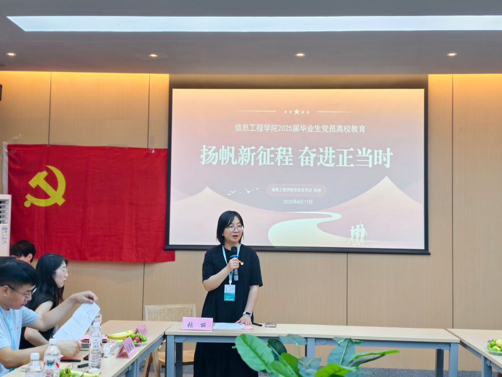 6月17日下午,信息工程学院党总支在“一站式”学生社区辅导员工作室以“党旗领航・重温初心使命”为主题,开展党日活动暨毕业生党员离校教育活动。活动通过专题党课、成长回顾、宣誓仪式等环节,为毕业生党员上好离校前的“最后一堂党课”。学院党总支书记、副书记、各党支部书记及全体学生党员参加。