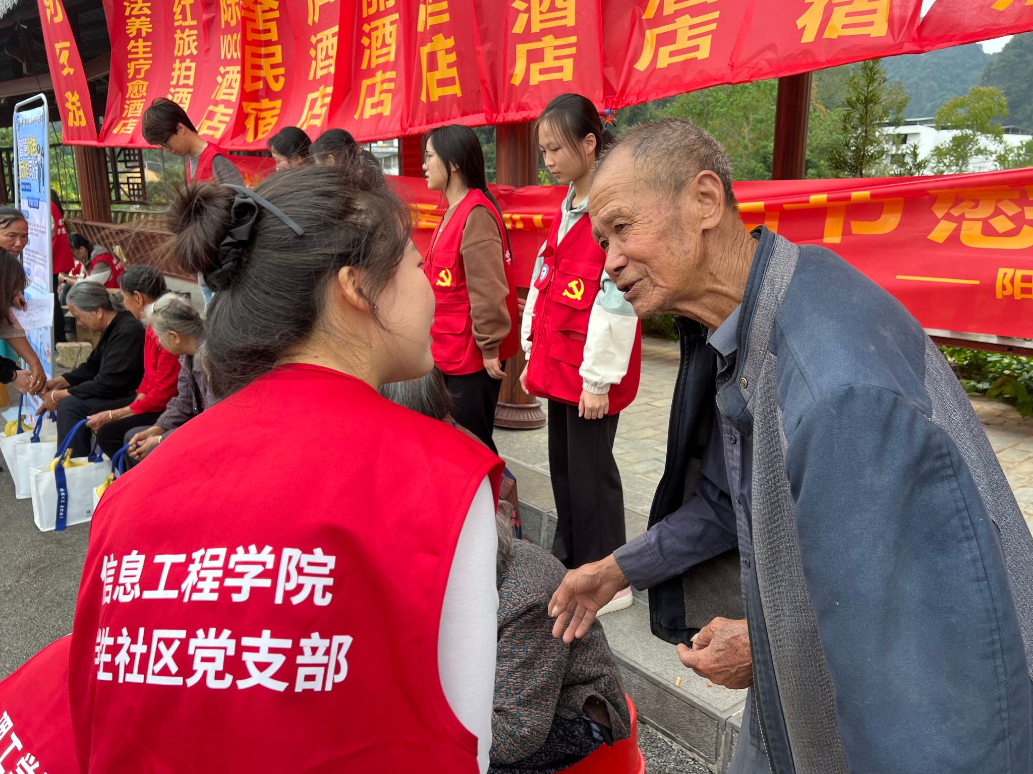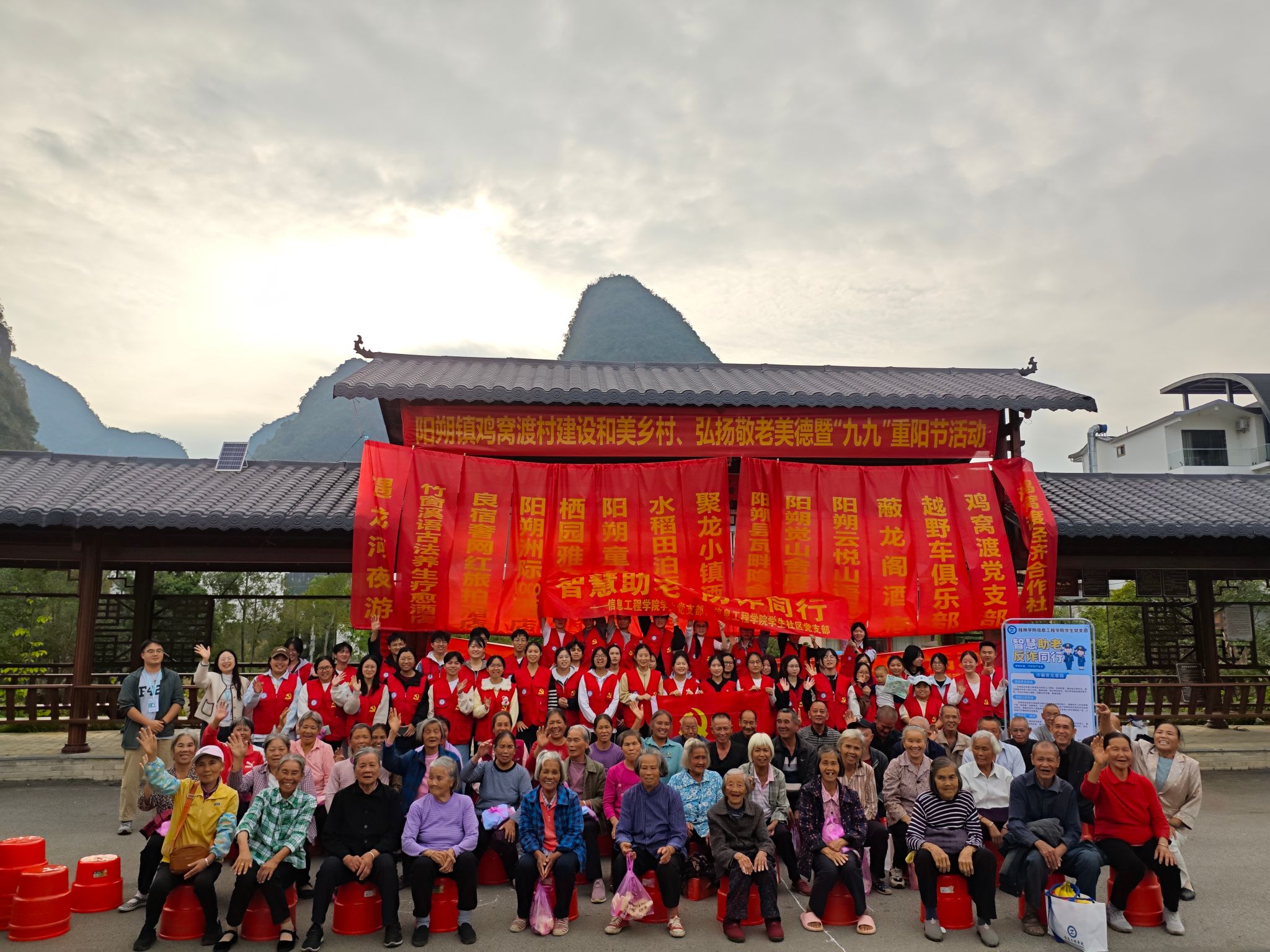 10月29日下午,信息工程学院50余名师生志愿者前往桂林市阳朔县鸡窝渡村开展以“智慧助老,防诈同行”为主题的重阳节活动。