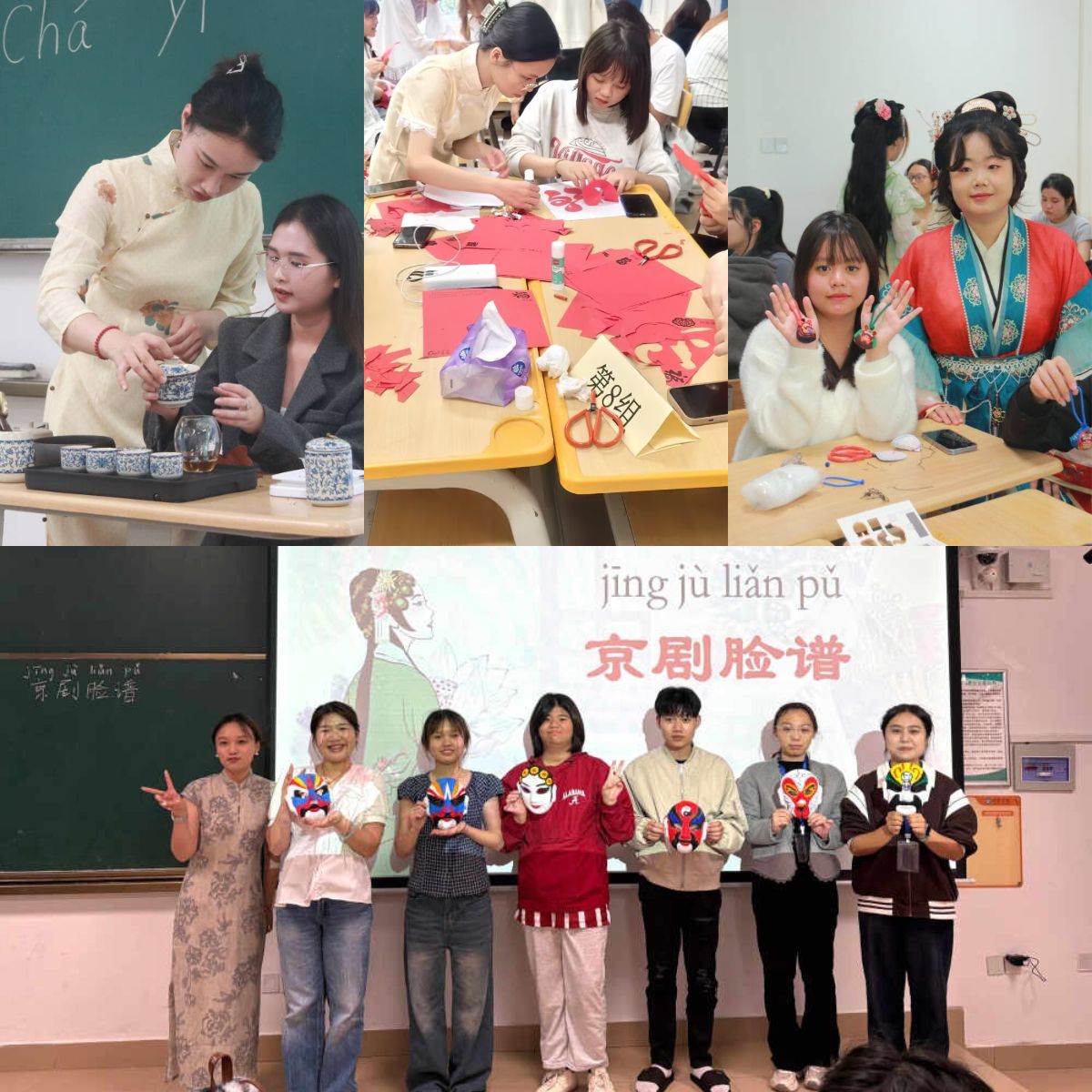 学院师生与广西师范大学留学生们一起体验茶艺、剪纸、香囊制作与脸谱绘制