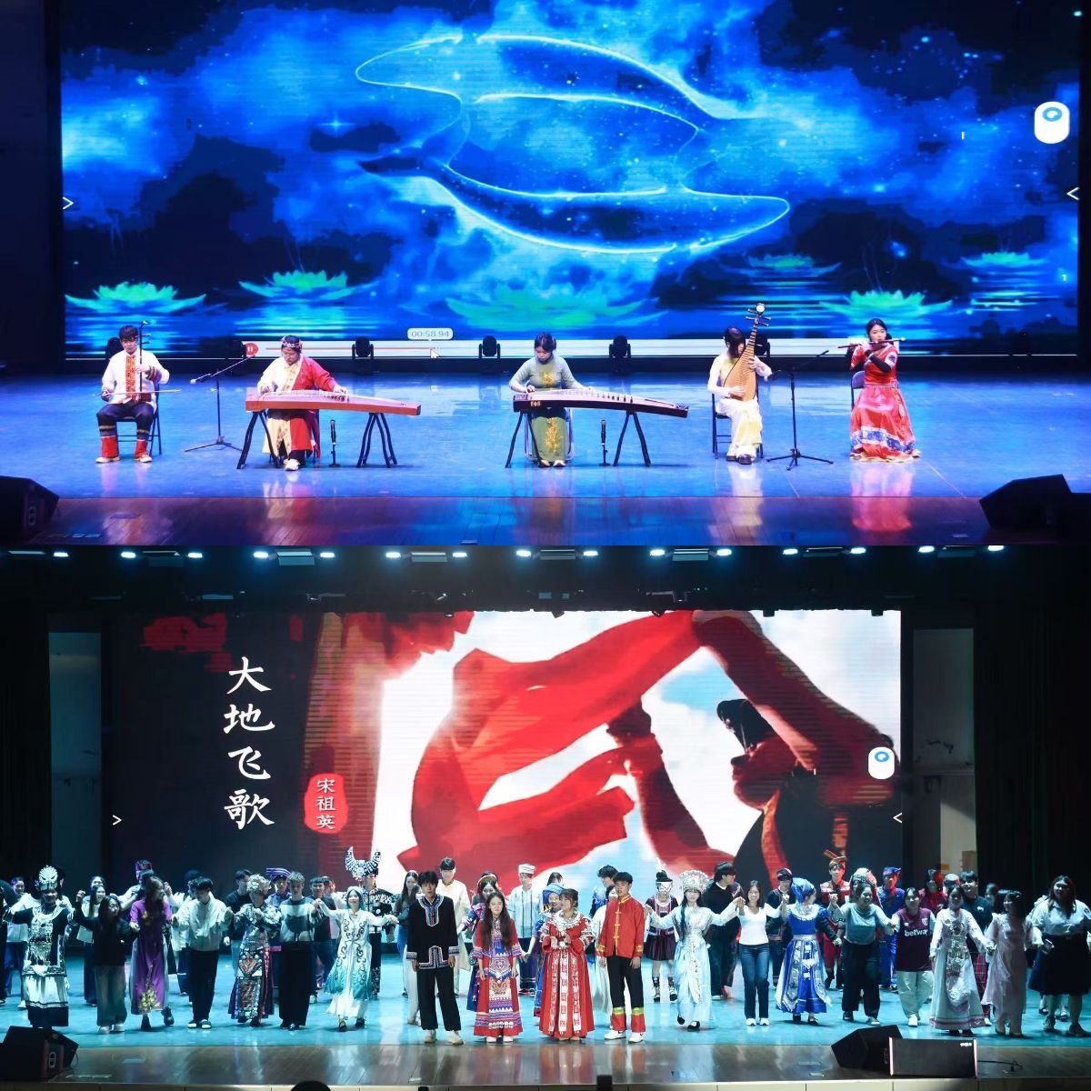 学院学生表演民乐合奏《大鱼》,中外学生一起表演民族歌舞《大地飞歌》