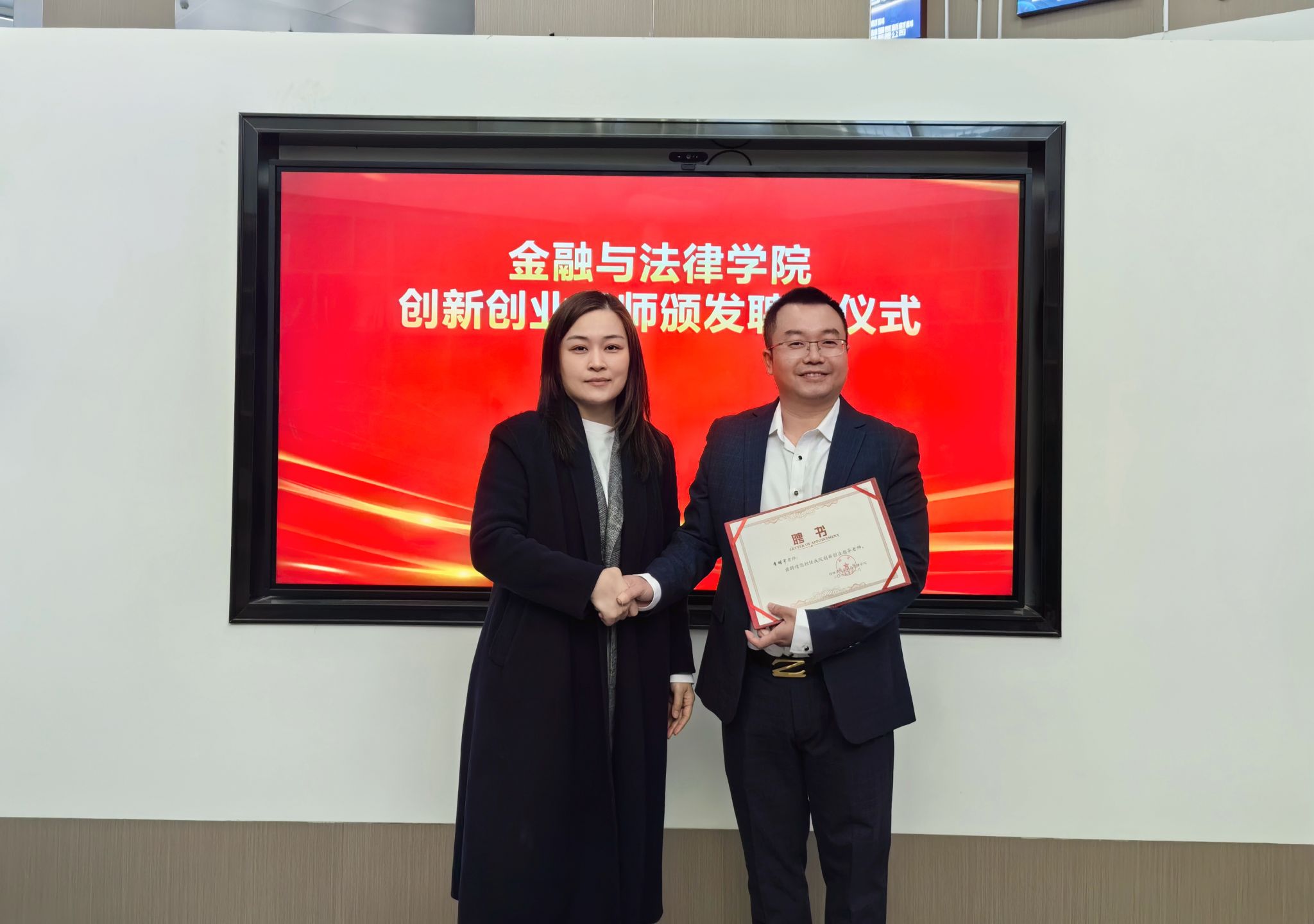 揭牌仪式后,与会人员在工作人员引导下参观了雁山智慧谷,深入了解园区建设进展、产业生态及相关扶持政策。随后,金融与法律学院院长为园区创新创业导师颁发聘书,聘请李明宇为学院学子创新创业之路保驾护航。