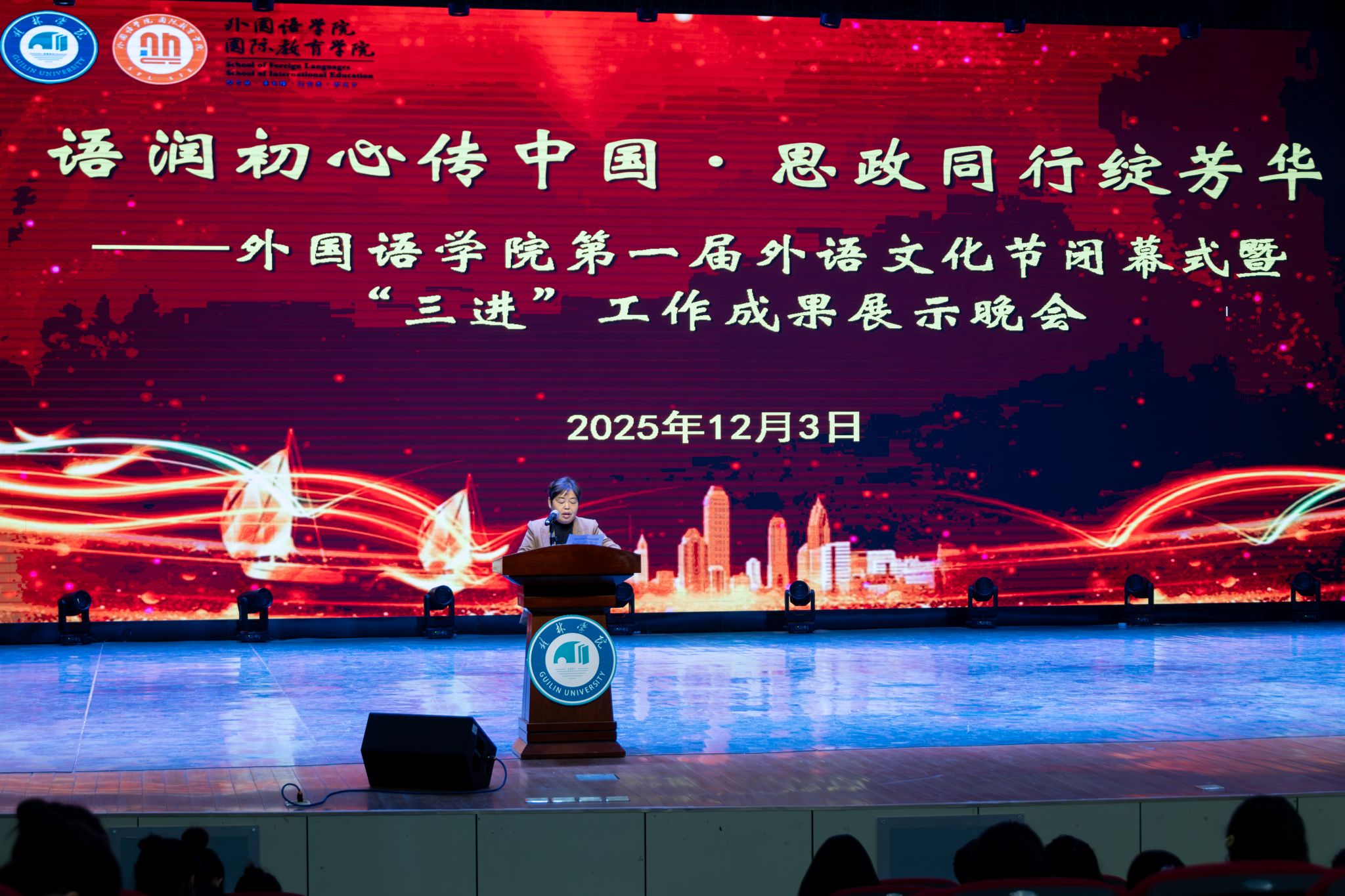 12月3日晚,外国语学院第一届外语文化节闭幕式暨“三进”工作成果展示晚会在弘善讲堂隆重举行。本次活动以“语润初心传中国,思政同行绽芳华”为主题,副校长兼外国语学院院长何玲、学院其他领导班子成员出席,师生代表齐聚一堂,共同见证这场融合外语魅力与思政内涵的校园文化盛宴。