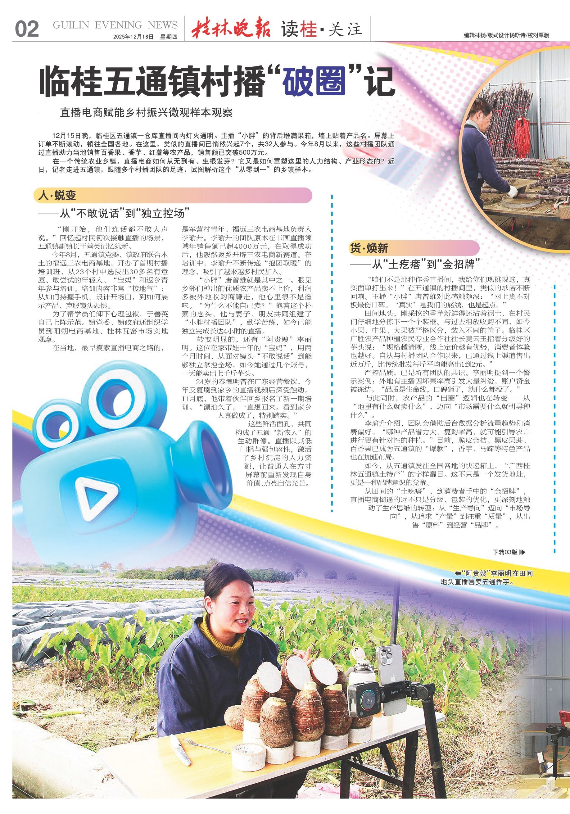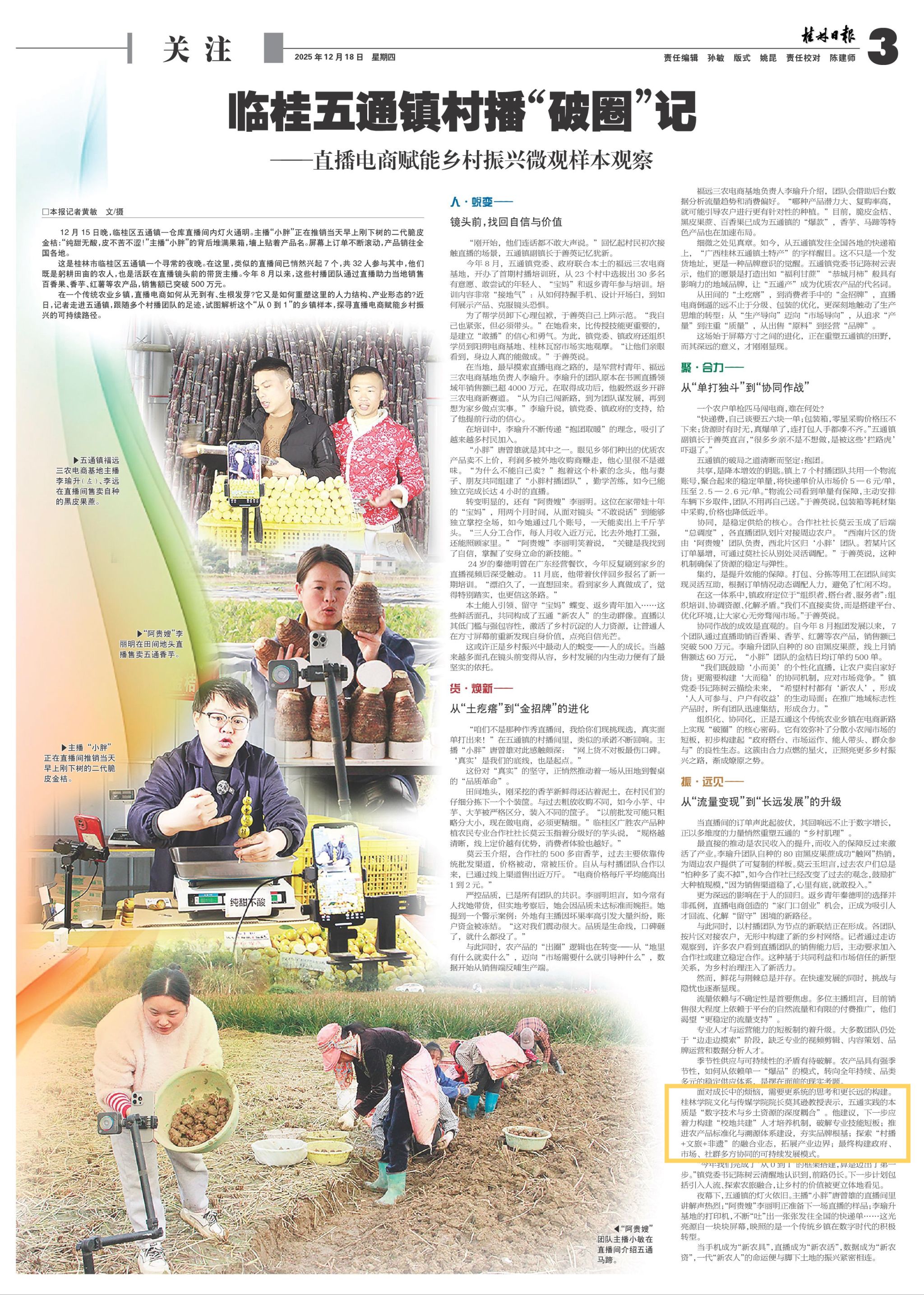 近日,桂林日报、晚报推出深度调查专题《临桂五通镇村播“破圈”记——直播电商赋能乡村振兴微观样本观察》,专题聚焦临桂五通镇以村播为抓手,赋能农产品销售、传承非遗文化、助力乡村振兴的创新实践,引发社会广泛关注。文化与传媒学院院长受邀为该专题撰写评述意见,从文化传播与产业融合的专业视角,深度解读五通镇村播破圈的内在逻辑与示范价值。