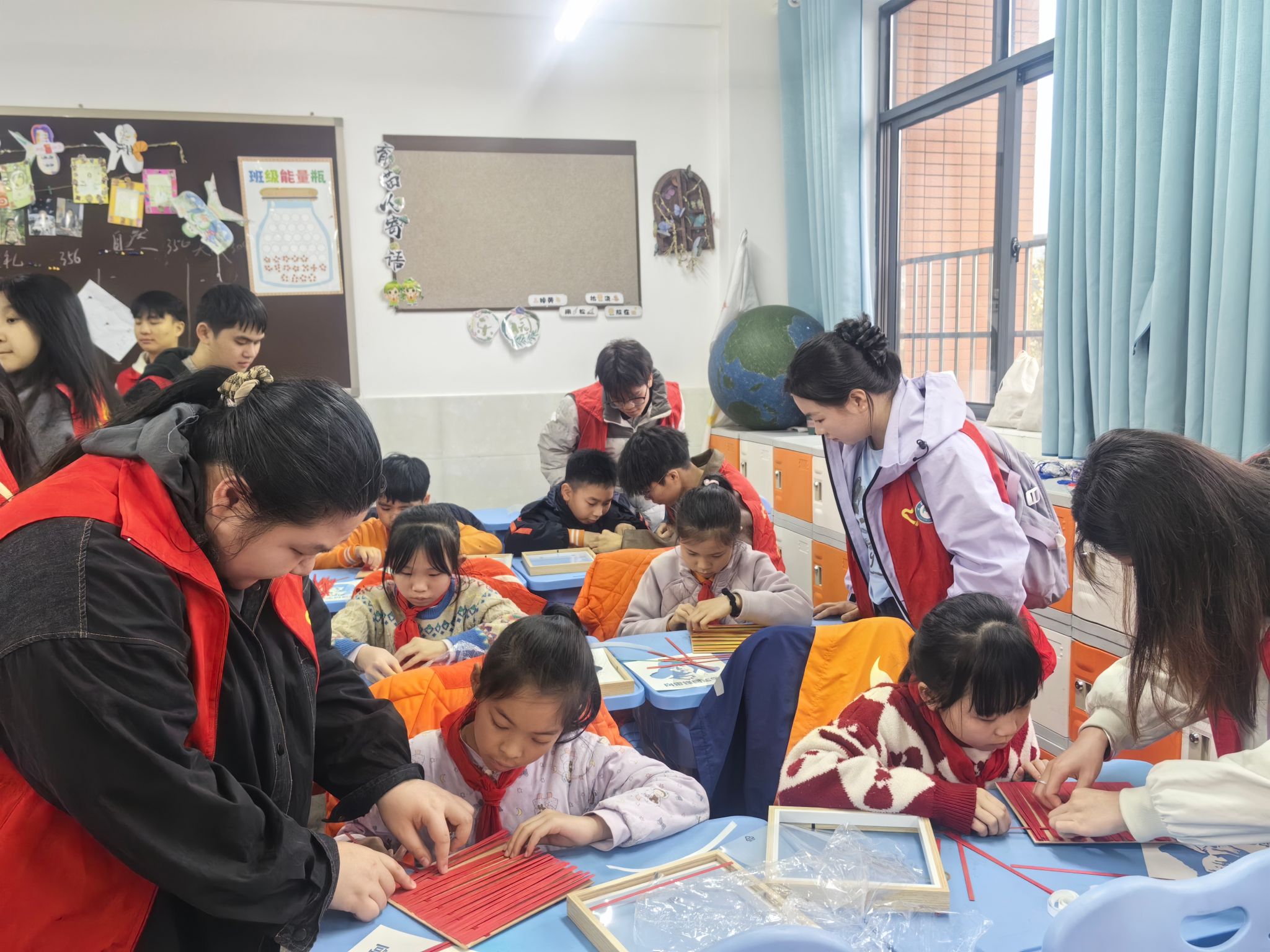 在非遗竹编体验环节,大学生志愿者们以“一挑一压”的传统技法为切入点,带领学生亲手制作“向雷锋同志学习”主题竹编相框。经纬交错的竹丝间,孩子们不仅感受到中华优秀传统文化的精妙,更在专注与协作中体悟雷锋同志干一行爱一行、专一行精一行的敬业精神与奉献品格。