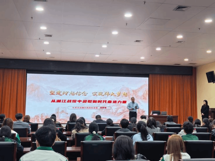活动中,全体师生怀着崇高的敬意,在烈士陵园庄严肃立,向湘江战役中英勇牺牲的革命先烈默哀致敬、鞠躬献礼,深切缅怀先烈们的革命壮举。随后,红军长征湘江战役纪念馆胡雅馨副馆长以“从湘江战役中汲取新时代奋进力量”为题讲授党课,结合珍贵史料生动梳理战役的历史背景与战斗进程,深入解读“勇于胜利、勇于突破、勇于牺牲”的湘江战役精神内核,引导师生从革命先烈的奋斗历程中汲取攻坚克难、砥砺前行的精神力量。