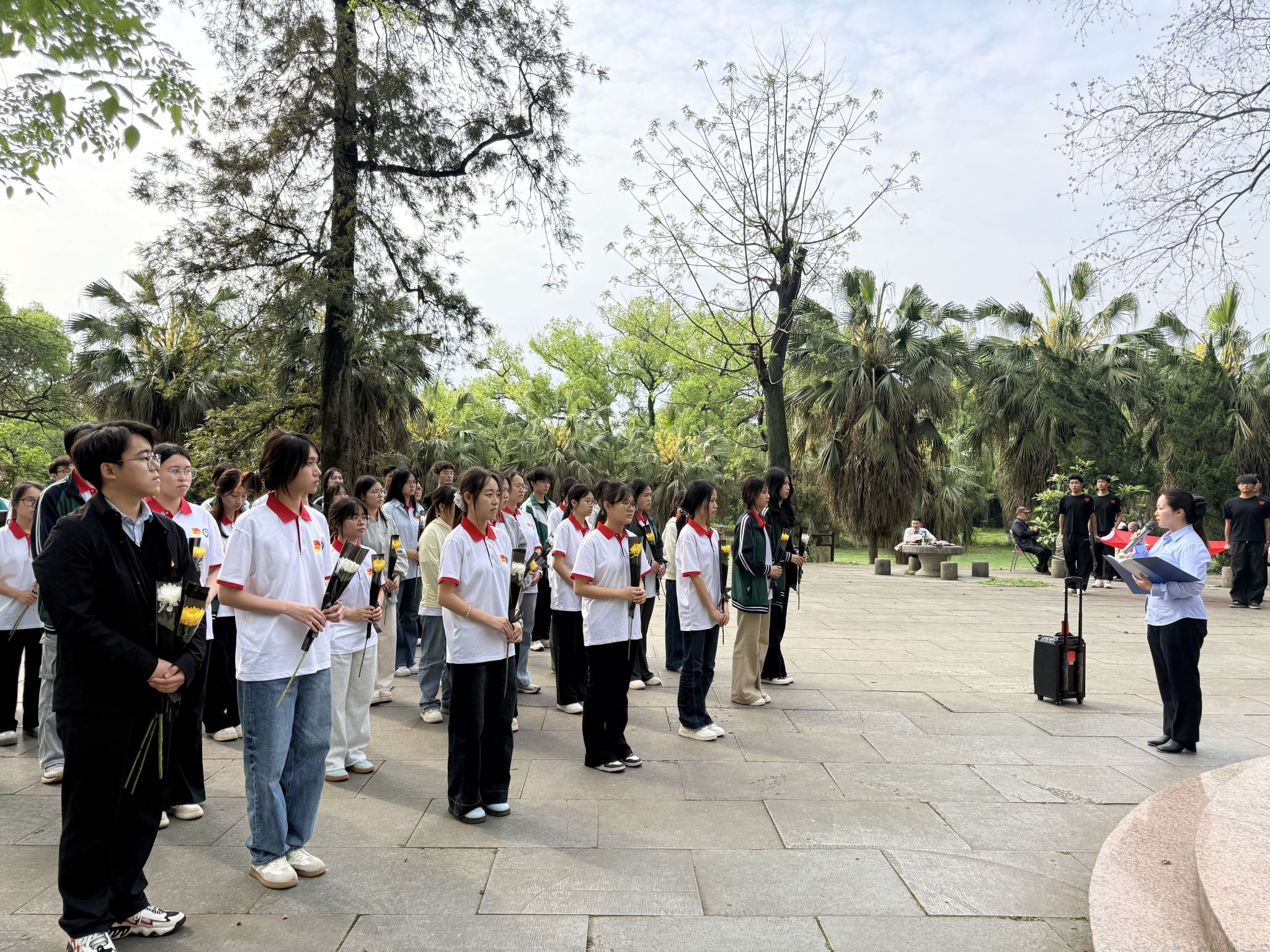 随后,全体人员面向团旗,举起右拳,重温入团誓词,铿锵有力的誓言回荡在纪念塔前,既是对入团初心的回望,也是对革命英烈的庄严承诺,更彰显了青年一代传承红色血脉、勇担时代使命的坚定决心。活动最后,师生们缓步上前,向英烈敬献鲜花,动作轻柔而专注,一束束菊花承载着青年一代对英烈的追思与敬仰。