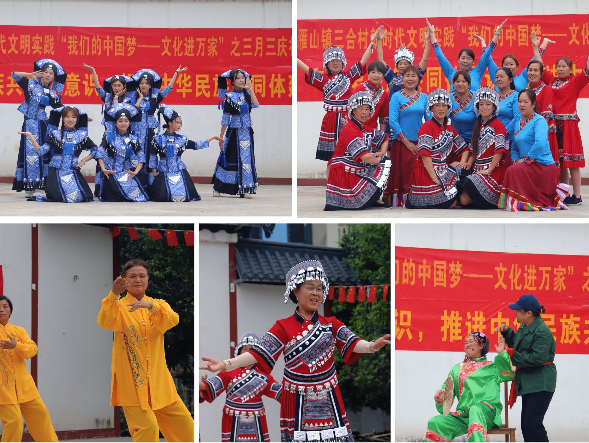 文艺展演环节更是精彩不断。志愿者与村民轮番登台,民族舞、广场舞、鼓舞、小品、山歌对唱、竹竿舞等节目接连上演。悠扬的山歌在村中回荡,灵动的舞姿洋溢着民族风情,铿锵的鼓点敲出蓬勃朝气。台上台下互动热烈,掌声与笑声交织,大家在欢声笑语中拉近了距离,传递着民族团结的暖暖正能量。