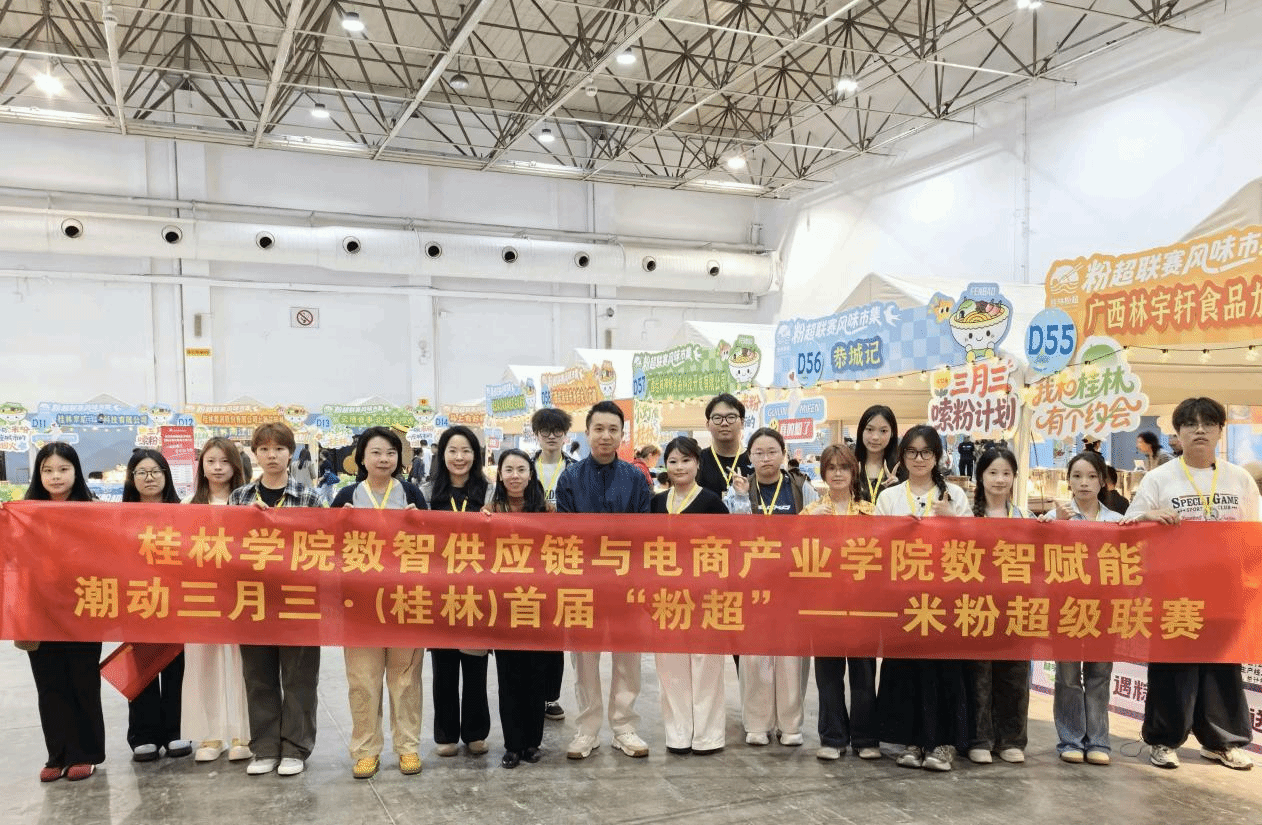 4月17日,首届“米粉超级联赛”在桂林甲天下会展中心开幕。我校电子商务教研室5位老师带领数智供应链与电商产业学院15名学生应邀深度参与,以专业实践对接地方文旅消费,用数智电商力量助力特色产业传播,推动产教融合与数智赋能落地增效。