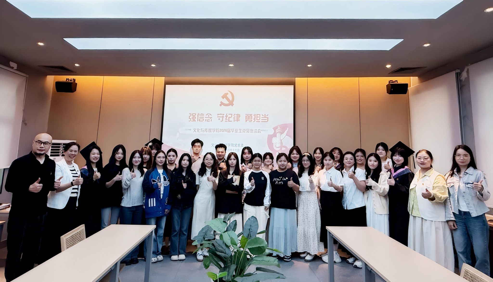 为进一步强化毕业生党员意识、筑牢思想根基、助力高质量就业,4 月16日,文化与传媒学院党总支以“强信念 守纪律 勇担当”为主题,召开 2026 届毕业生党员座谈会,为即将踏上新征程的青年党员凝心铸魂、鼓劲领航。学院党总支书记出席会议并讲话,党总支副书记、学生党支部书记、学生社区党支部书记、专职组织员和全体 2026 届毕业生党员参加。