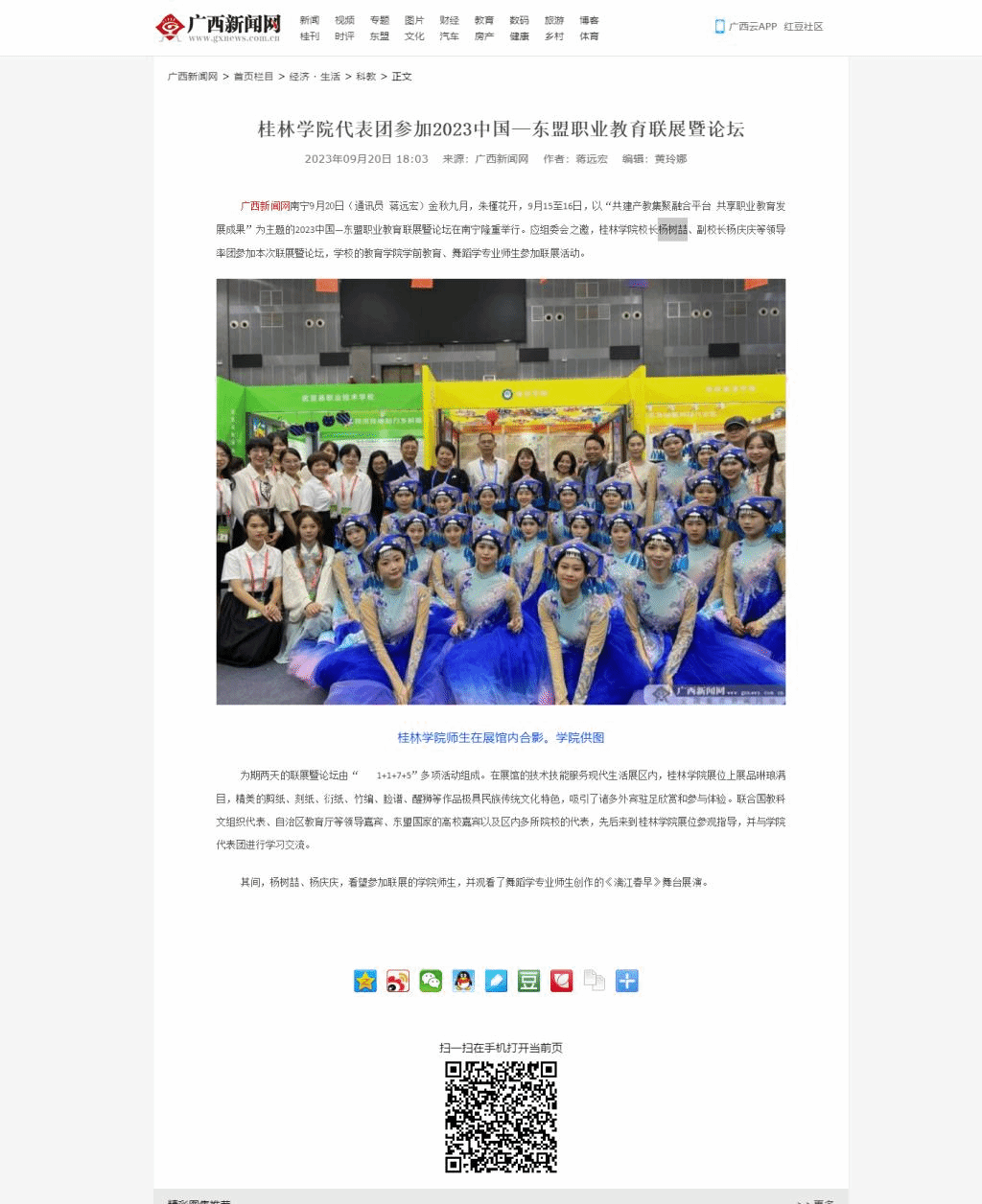 9月20日,广西新闻网以《桂林学院代表团参加2023中国—东盟职业教育联展暨论坛》为题关注报道了我校师生参加2023中国-东盟职业教育联展暨论坛的盛况。我校校长杨树喆、副校长杨庆庆等领导率团参加2023中国一东盟职业教育联展暨论坛。我校教育学院学前教育、舞蹈学专业师生参加了相关联展活动。