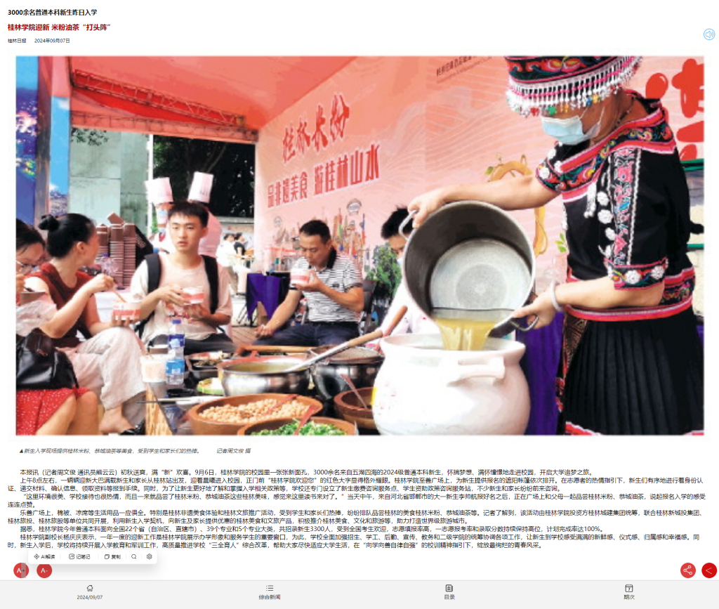 桂林日报《3000余名普通本科新生昨日入学 桂林学院迎新 米粉油茶“打头阵”》