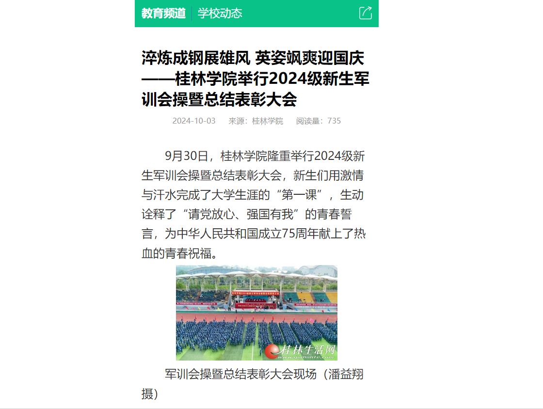 2.桂林生活网《淬炼成钢展雄风 英姿飒爽迎国庆——桂林学院举行2024级新生军训会操暨总结表彰大会》