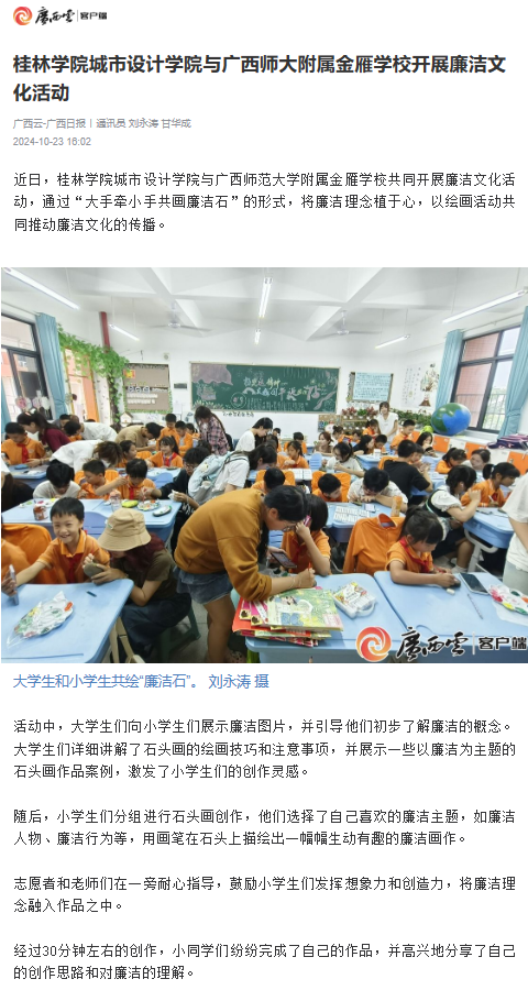 10月下旬,桂林学院城市设计学院与广西师范大学附属金雁学校共同开展廉洁文化活动,通过“大手牵小手共画廉洁石”的形式,将廉洁理念植于心,以绘画活动共同推动廉洁文化的传播。