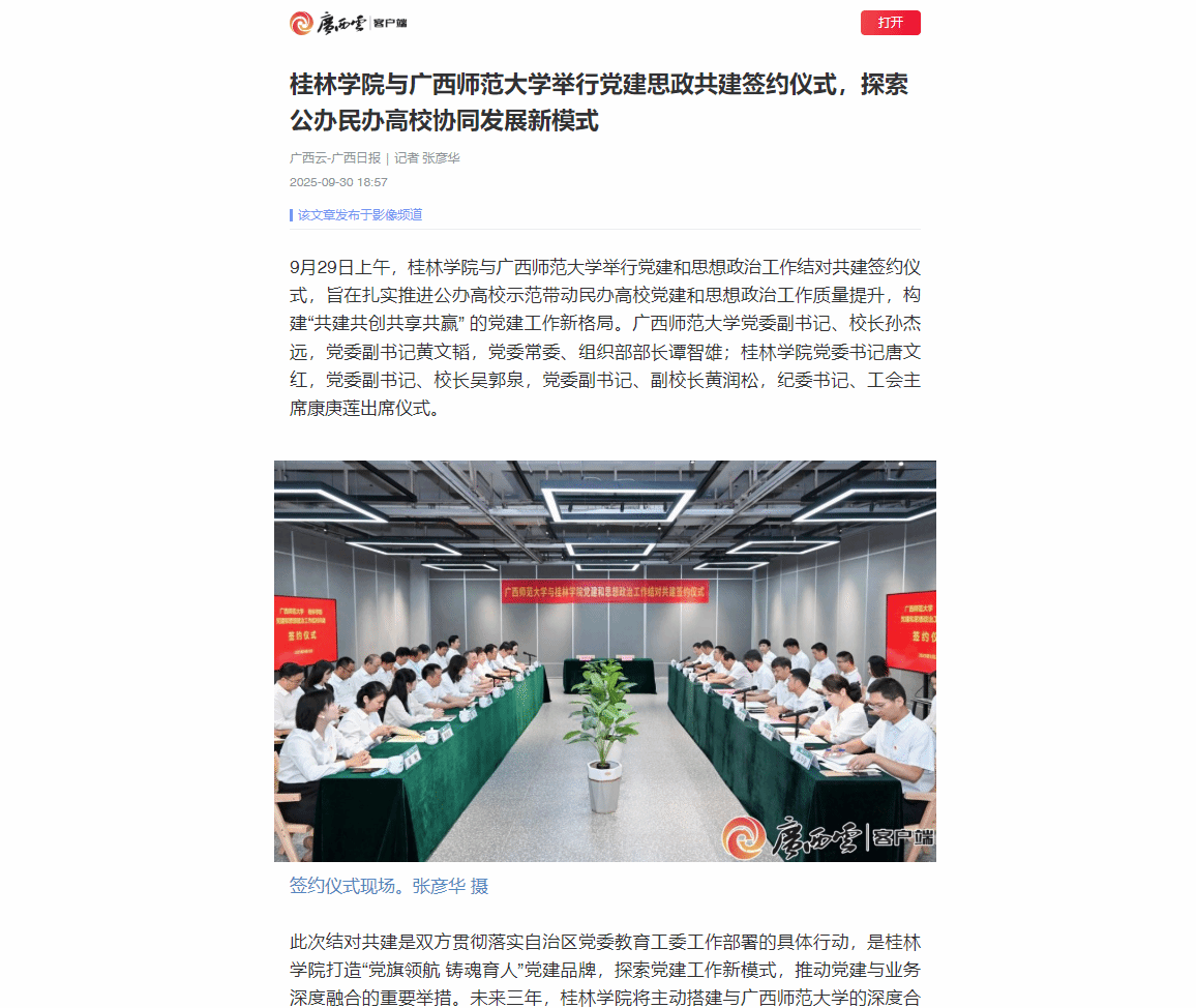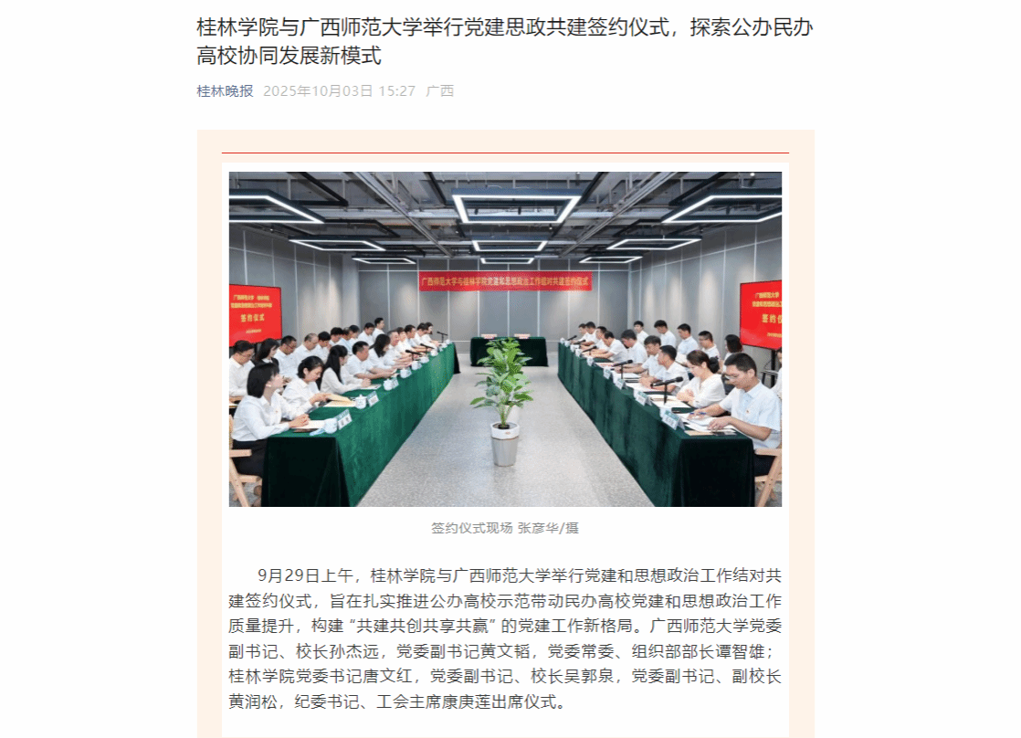 桂林晚报:《桂林学院与广西师范大学举行党建思政共建签约仪式,探索公办民办高校协同发展新模式》