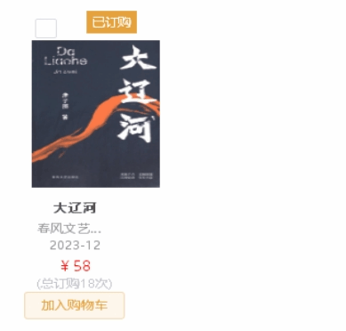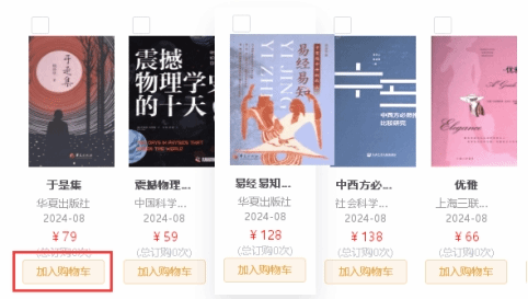 加入购物车:任意书单、分类界面点击进入书目列表页,点击将您心仪的图书加入购物车
