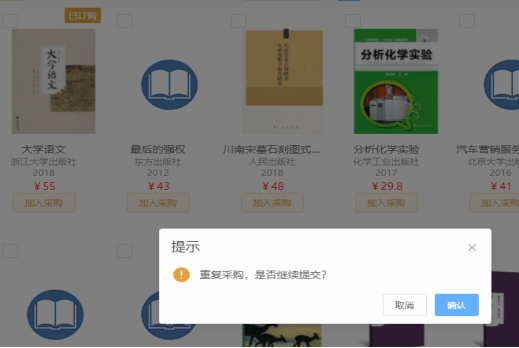 4、已订购的数据自动显示已订购,将重复书籍放入购物车会提示,批量提交会显示重复列表。