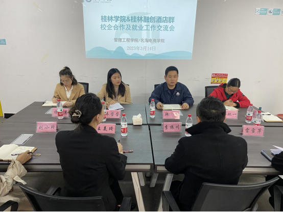 3月14日,管理工程学院在3207与桂林融创酒店群召开校企合作及就业工作交流会,桂林融创酒店群总经理李振川、雷萍经理,管理工程学院党总支副书记韩磊、旅游教研室奉莹莹等参加会议。