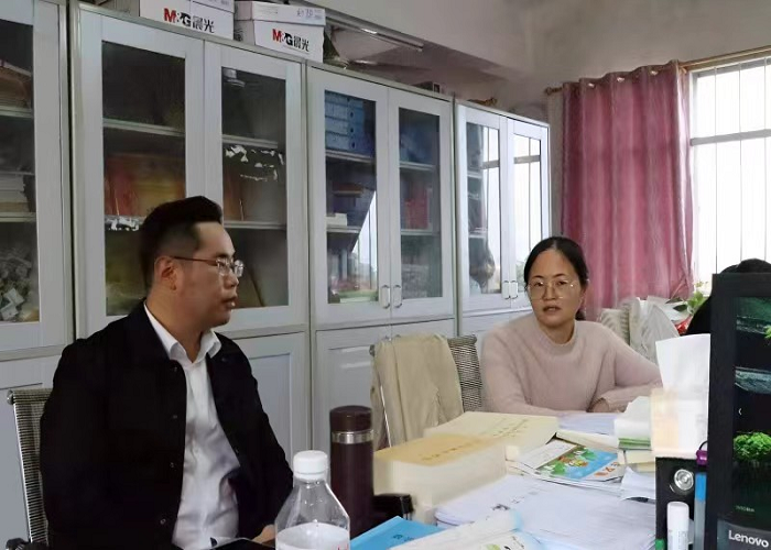 图为宋丹阳与新民小学蒋校长交流现场