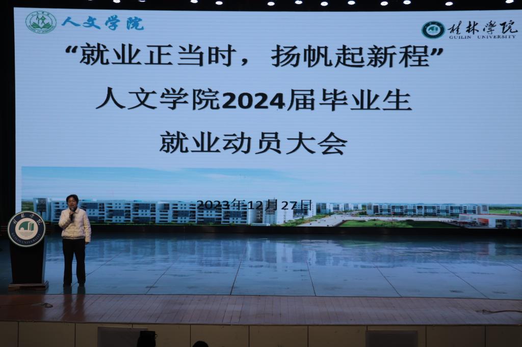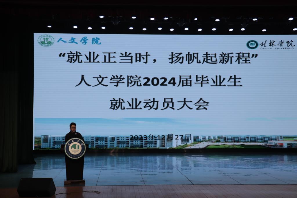 为全面落实学校关于做好2024届毕业生就业工作的相关部署要求,12月27日上午,人文学院在弘善讲堂举行2024届毕业生就业动员大会。副校长、人文学院院长何玲出席会议并讲话。学院领导班子成员、教研室主任、2024届毕业生辅导员出席会议,2024届全体毕业生通过线上线下方式同步参会。会议由人文学院党总支书记、副院长庞一飞主持。