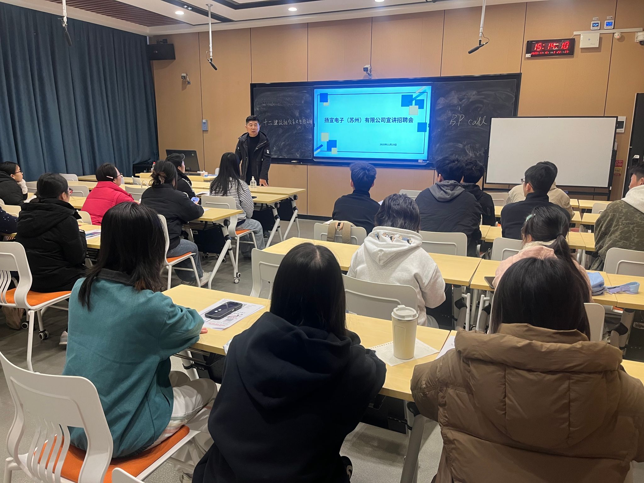 宣讲环节中,蒋传利主任围绕建滔集团的发展历程、行业地位及扬宣电子(苏州)有限公司的运营现状展开详细介绍,从业务布局到核心优势,全方位展现了企业的综合实力。他重点解读了本次招聘的岗位职责、任职要求,明确了极具竞争力的薪资福利体系及清晰的职业晋升路径,为学子们勾勒出可触可及的职业发展蓝图。为打破空间壁垒,让同学们直观感受海外工作环境与跨文化职场氛围,宣讲会创新设置实时视频连线环节,蒋主任现场接通公司越南籍在职员工,通过面对面交流解答同学们关于工作场景、生活适配、文化融入等核心疑问,真实的体验反馈与生动分享将现场气氛推向高潮。