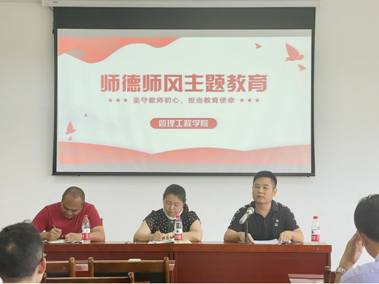 6月29日,管理工程学院党总支在图书馆C馆会议室召开师德师风主题教育活动,活动由党总支书记韩磊主持,采用线上+线下相结合的方式进行,学院新一届领导班子以及学院教师参加了此次活动。
