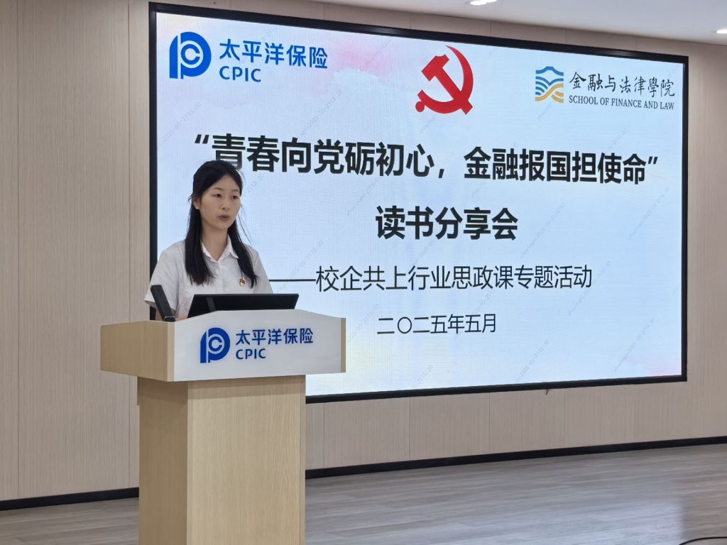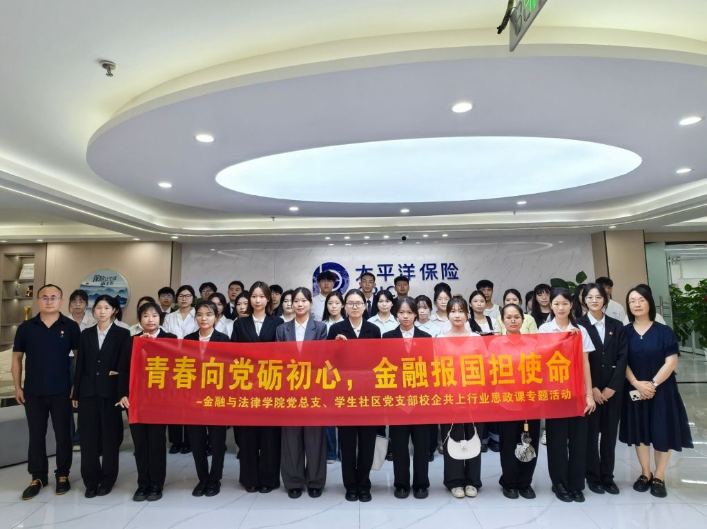为进一步深化校企合作,推动党建与专业教育深度融合,5月21日,金融与法律学院党总支联合中国太平洋财产保险股份有限公司桂林中心支公司党支部(以下简称“桂林中支公司党支部”)开展“青春向党砺初心,金融报国担使命”主题活动。桂林中支公司党支部书记、总经理刘延宗、副总经理陈健、李紫垣、综合管理部经理唐霏、金融与法律学院院长、理论经济学教研室主任、保险学专业负责人、学生社区党支部书记及学院师生党员代表、企业党员代表共50余人参加活动。通过实地参观、主题分享、交流研讨形式,共绘校企党建联建新图景。