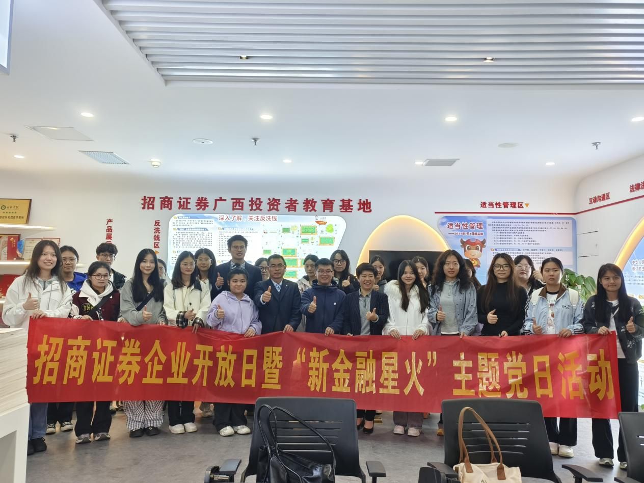 11月7日,金融与法律学院教师党支部、金融学专业师生代表赴招商证券桂林营业部开展企业开放日暨“新金融星火”主题党日活动,通过实地参访、专家交流与公益捐赠,深化校企合作,共谱协同育人新篇章。