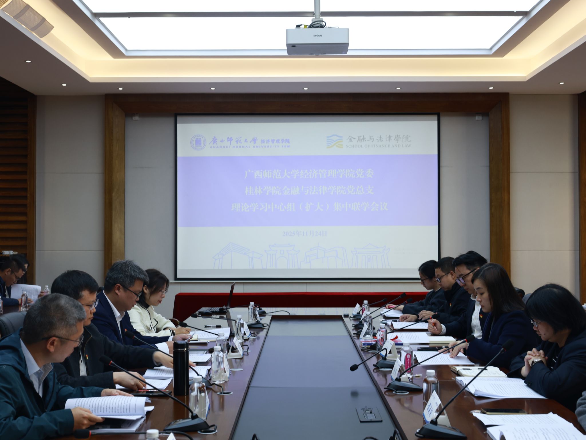 11月24日上午,广西师范大学经济管理学院党委与桂林学院金融与法律学院党总支在师大雁山校区起文楼第四会议室联合举办理论学习中心组(扩大)集中联学暨结对共建启动仪式。两校学院党政领导班子成员、党委(党总支)委员、党支部书记、辅导员等相关人员齐聚一堂,以理论学习凝聚共识,以结对共建共促发展。会议由广西师范大学经济管理学院党委书记陈国华主持。