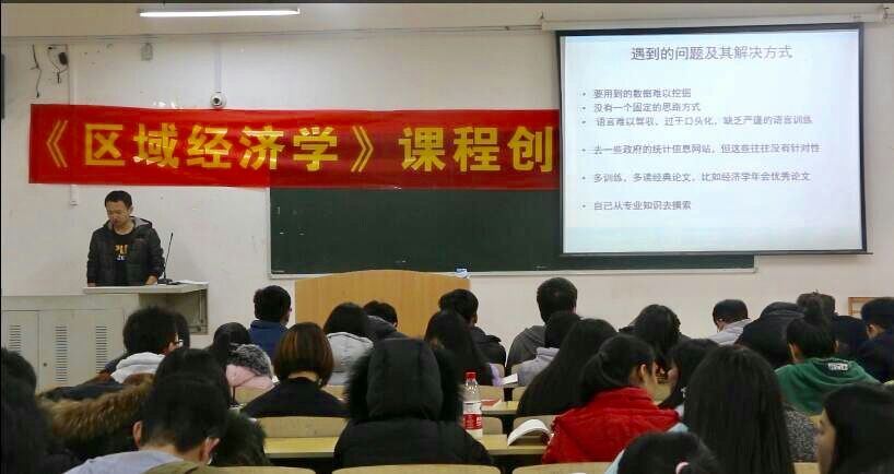 2016年12月13日晚上19:00—21:20,经济政法系在1317教室成功组织了《区域经济学》课程创新考核活动。此次创新考核活动举办的主体对象是经济政法系2014级经济学专业全体学生。考核的主体内容是:该专业两个班中的每名同学,确立某一个区域为中心,以区域经济学中的梯度发展、增长极理论、两元经济等课程知识为理论依据,重点分析该区域中的某些产业或企业,分析其产业背景、其在区域发展中的战略地位、相关的政策法规以及各项基本经济指标等。