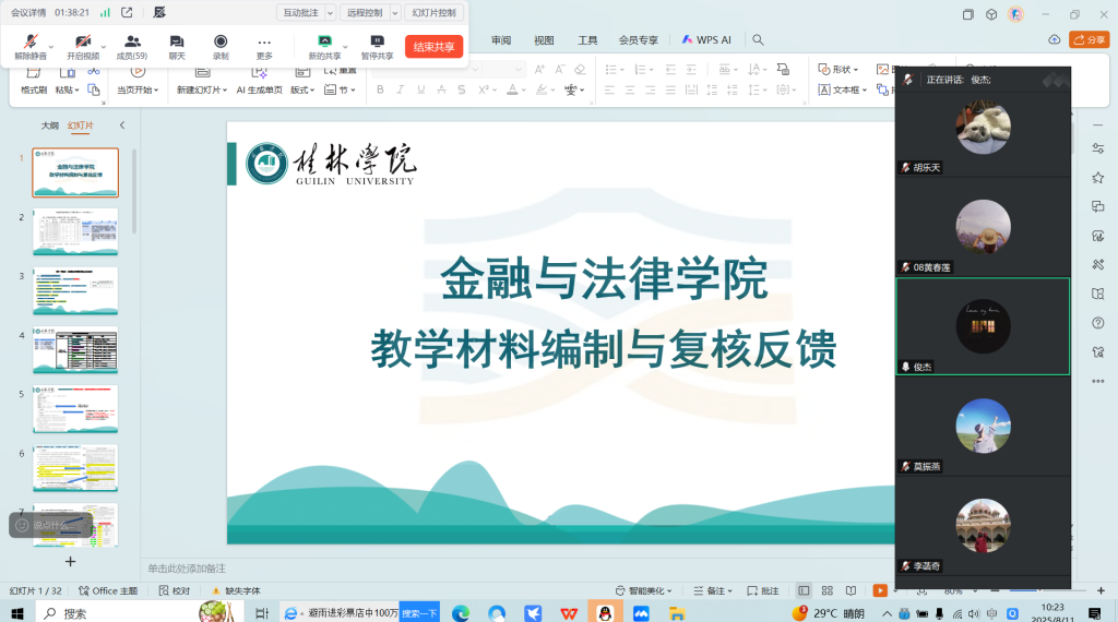 为进一步规范教学材料编制工作,提升教学质量与教学管理水平,金融与法律学院于8月11日组织召开暑期教学材料编制与复核反馈培训会。会议围绕《桂林学院教师教学工作量计算办法(2025年修订)》展开系统讲解,并结合近期试卷复查、实习与论文指导、课程思政建设等方面进行深入反馈与部署。