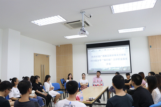 活动伊始,钟林林老师向广西维冠律师事务所的苏日好主任以及各位律师表示了热烈的欢迎,并向律师们介绍了2016级法学“知行班”的基本情况与教育理念,“知行班”新颖的教学理念与模式得到了苏日好主任与各位律师的肯定。随后,2016级法学“知行班”的同学们依次就自己目前学习所遇到的疑惑和难题,以及对于自己未来的法律职业规划和方向等问题与苏日好主任和两位律师展开了亲切交流。苏日好主任以其多年的学习和工作经历为例,一一为同学们答疑解惑。苏日好主任认为,对于法学同学来说,在校时应及早的找到自己的兴趣所在,多出去走走,去体验更多不一样的东西。同时更应该及早的做出自己未来的职业方向与规划,这样才会有目标有计划有信心去完成自己对自己所作出的规划和目标,才能更好的从法学生进阶到一名优秀的法律人。最后,苏日好主任对未来即将从事法律职业的同学们提出了建议:应明确好法律职业所应具备的专业素养,强化法律逻辑思维,多关注热点事件,用法律人的角度和思维去解读事件并有自己的想法和感悟,同时应多去律师事务所、公检法等多贴近职业生活,了解职业知识,为自己的职业方向选择和规划提供参考。