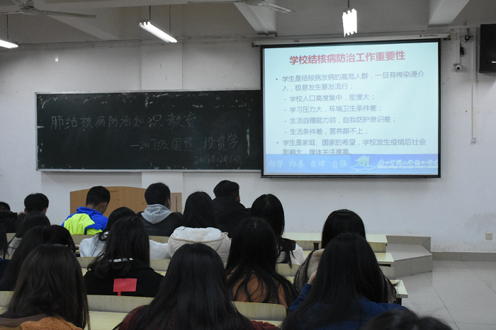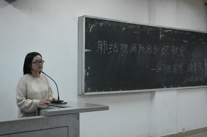 该活动由林凤凤老师为主讲人,通过PPT形式为大家介绍了何为结核病以及其我国结核病的现状,使同学们了解到结核病是由结核分枝杆菌引起的慢性传染病,可侵及许多脏器,以肺部结核感染最为常见,而高中生及大学生更是该病的高发人群。同时,数据表明我国是世界上22个结核病高负担国家之一,患者人数仅次于印度居全球第二位。并结合8月桃江学生肺结核的事件,结核病的预防显得极为重要。接下来,林凤凤老师教授了同学们有关肺结核病的基本常识,并就学校区域范围进行特定的讲述。并从感染者的角度强调了患病人群要注意自身的日常行为,避免感染到其他的人。在讲话最后,她提到了学校等集体一定要做好预防措施,防患于未然,为建设健康校园而努力。
