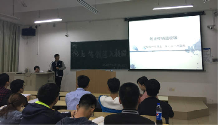 此次活动主要有两个环节。首先由16金融学2班文艺委员杨金彪进行关于传销案例的宣讲。在主持人宣布活动开始后,杨金彪同学向同学们介绍了关于传销的四个方面的内容。一、传销是什么?二、传销有什么危害?三、传销的传播方法以及对象,其中重点讲解了5种传销的洗脑术,四、我们应该如何防止传销。在讲解的过程中杨金彪同学以现实生活中的案例让大家深刻认识到了传销的危害,同时也提高了同学们的防范意识。第二个环节是观看与传销相关的视频。同学们都全神贯注地投入到视频的内容当中,观看完视频后深刻地意识到传销的危害,懂得如何更好地去保护自己。
