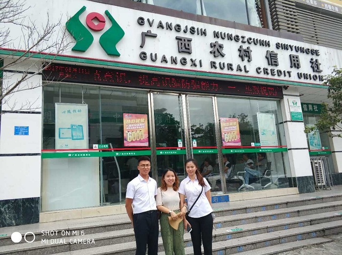 在实习学生周一帆的陪同下,孙琳老师在广西农村信用社营业网点与银行领导和柜员亲切交流,银行的同事对我校学生给予一致好评。北海分行对同学们来信用社实习实践表示欢迎,对大家一个月以来的实习予以肯定,我系实习生也分享了自己的实习感悟并感谢实习单位提供的宝贵机会,认为在学习和从事银行业务的同时更重要的是培养细心谨慎的态度和责任意识,获得领导和老师的赞许。在看望过程中,招商证券实习生余雨婷的指导老师梁经理在座谈中表示:我系学生表现出“勤奋好学、上手快、能吃苦”的品质,也给予较高的评价。