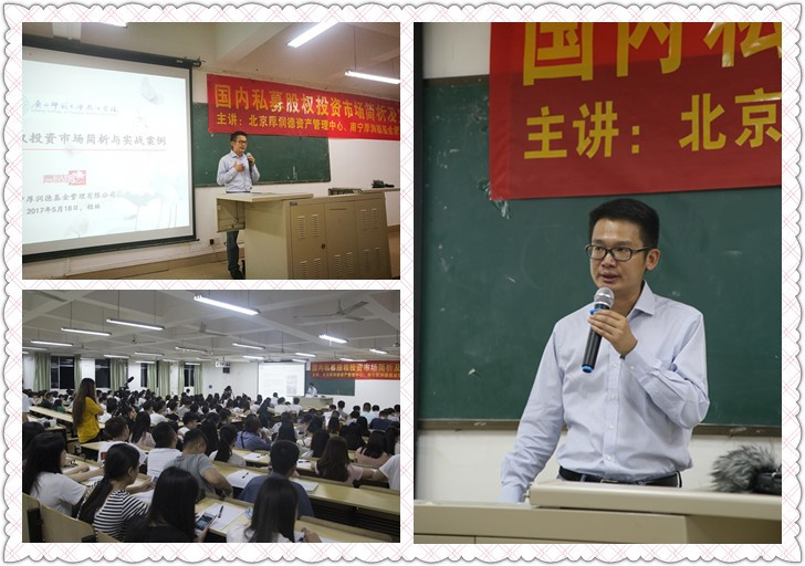 私募股权投资(PE)属于金融投资领域,由于我系金融学教研室缺乏该类实务的师资,课程虽有涉及却难以深入,同学们对此也关注甚少。在这次讲座中,廖总为学生详细讲解了私募股权投资的基本理论和私募股权投资市场的国内现状;通过讲授其亲历的大量实战案例,讲述了私募股权投资的操作流程。