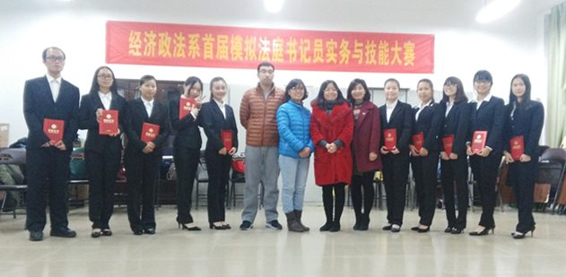 2016年11月25日,经济政法系首届模拟书记员实务与技能大赛在系模拟法庭拉开终局战幕,经过初赛选拔的2014级法学专业10名优秀学生进入决赛环节。漓江学院杨庆庆副校长、广西师范大学律师学院蓝兰主任(现在桂林市人民中级法院挂职)以及法学教研室老师到场督战,并担任决赛评审老师。