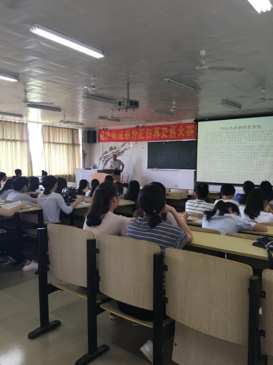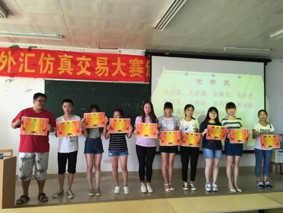 2016年6月22日,经济政法系外汇仿真交易大赛颁奖仪式暨客座教授专题讲座在1411会议室隆重举行。2014级国贸专业全体同学、经济政法系教研室胡乐天、向爱保老师,以及桂林市金泽投资公司总经理龚占冰先生等参加了此次仪式。