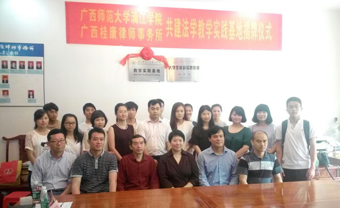 5月13日下午,广西桂康律师事务所与广西师范大学漓江学院经济政法系 “校外实践教学基地”揭牌仪式在广西桂康律师事务所隆重举行,学校副院长杨庆庆、广西桂康律师事务所主任李振华、广西著名法学家周世中教授、学校经济政法系党总支书记甘华成、法学教研室主任林驰等相关领导和老师共同参加了此次揭牌仪式。