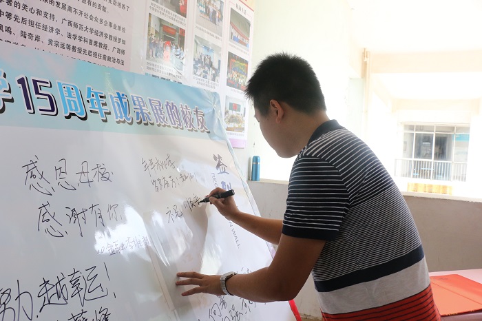 上午,系团总支书记陈海斌热切的接待了返校的校友,并邀他们在签名墙上留下对母校十五周年庆典的祝福。接着,由陈海斌带领大家一同参观了办学历史与成果展、至善文化成果展、杰出校友风采展以及各系教学成果展。 参观过程中,校友们愉快的谈起曾经的大学生活,并表示充分感受到了学校各个方面建设都越来越完善了,同时也很期待学校在未来的发展变化。陈海斌表示,学校永远会是校友们的坚强后盾,学校的大门也永远欢迎他们回来。同时,也希望校友们能多多与学弟学妹们交流,在学习生活中能给他们提一些好的建议。最后,陈海斌与校友们在历史成果展合影留念。