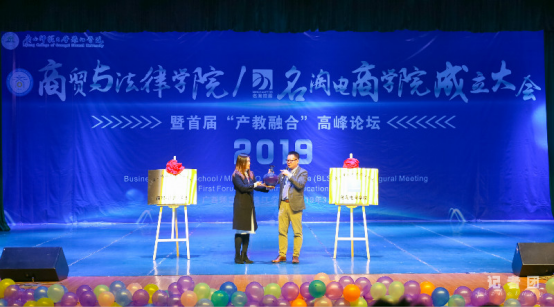 来自领导、师生、校友和合作单位的祝福视频拉开了建院大会的序幕。副校长杨庆庆代表学校宣读了商贸与法律学院/名淘电商学院成立文件和人事任命文件,并向学院成立表示祝贺。校长杨树喆、党委书记唐文红、浙江名淘投资控股有限公司副总裁江战、学院副院长林驰共同为学院揭牌。随后,江战副总裁代表浙江名淘投资控股有限公司向学院赠送礼物。