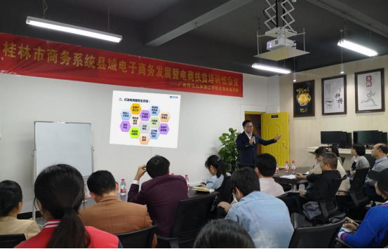 授牌仪式后,名淘电商学院江战副院长为桂林市商务局、各县区商务主管部门领导和业务负责人做了“挑战与机遇并存----县域电商后示范县时代布局思考”的主旨报告。