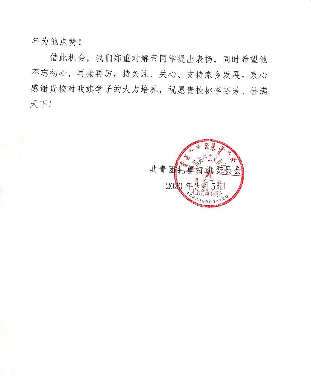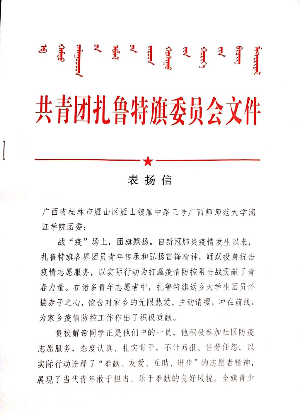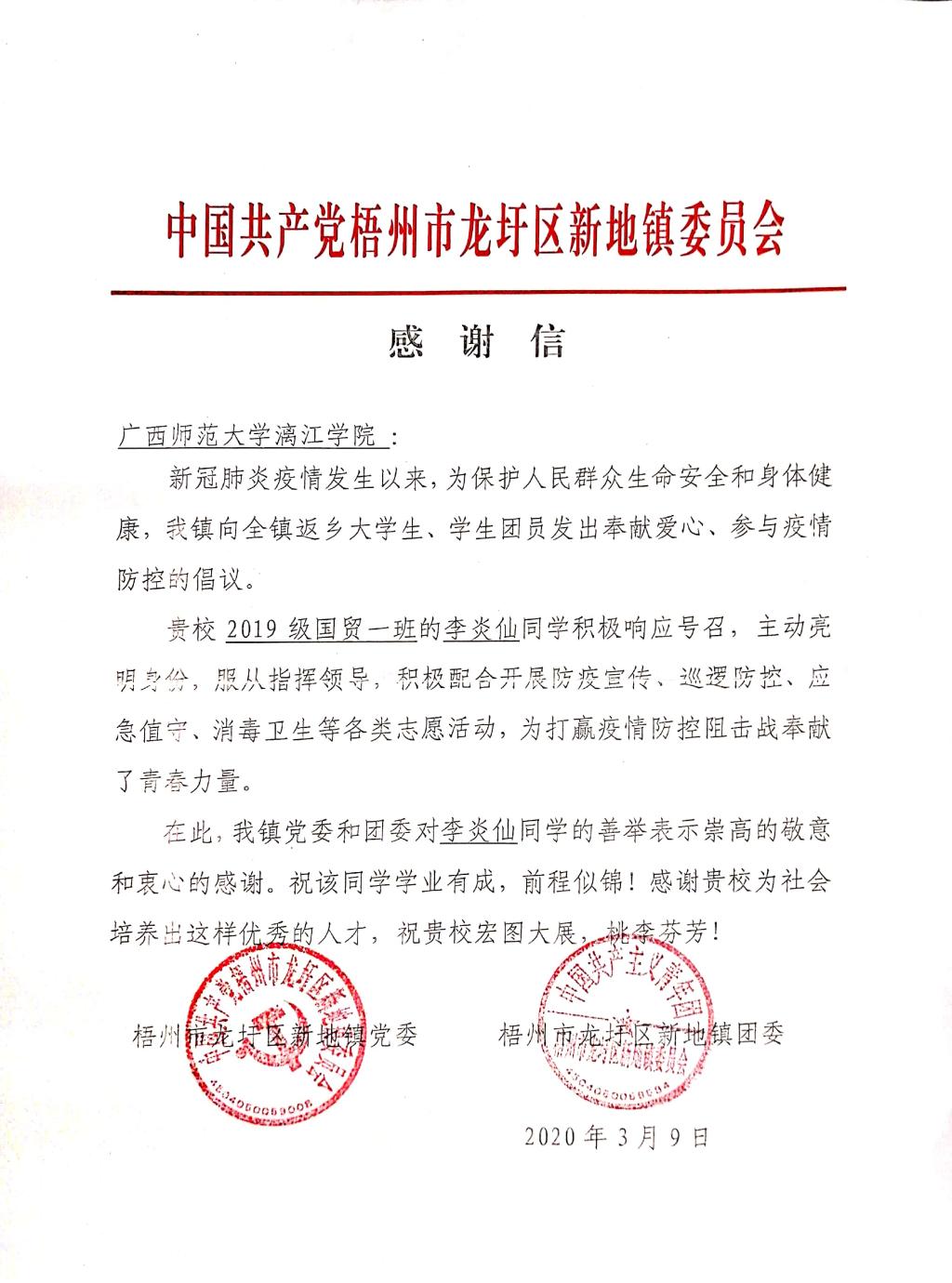 近日,我院收到来自内蒙古扎鲁特旗委员会、梧州市龙圩区新地镇党委向我校发来表扬信,信中对我院2019级国际经济与贸易专业解帝、2019级电子商务专业李炎仙2名同学在疫情防控工作中所作出的贡献予以肯定和表扬,对解帝、李炎仙两位同学及学校的大力培养表示衷心的感谢。