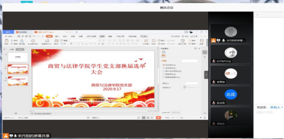 为进一步夯实我院党建工作,实现工作的无缝连接,加强并改进党员队伍建设,2020年9月17日下午,商贸与法律学院学生党支部于腾讯会议顺利召开党支部换届大会,学院党总支书记陈俊杰、副书记刘雪,学生支部书记宋丹阳、许承婷、谭海练老师等以及各学生党员、预备党员参加此次大会。