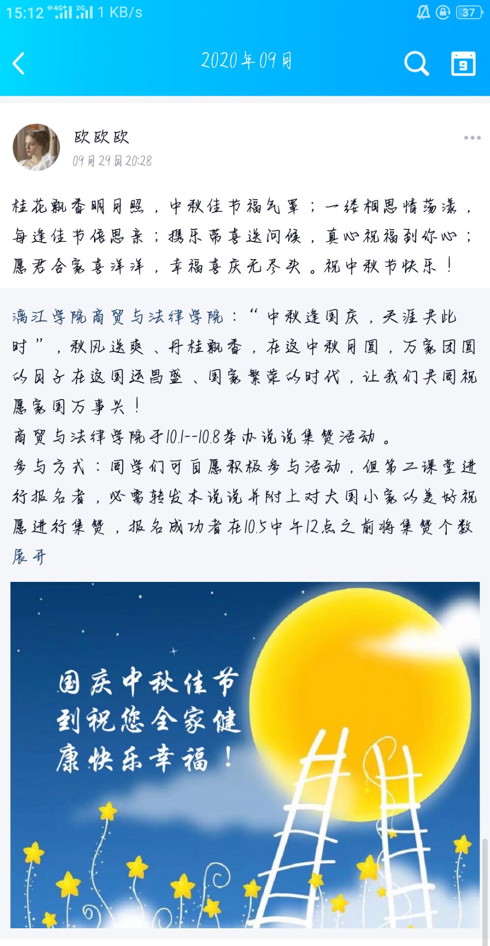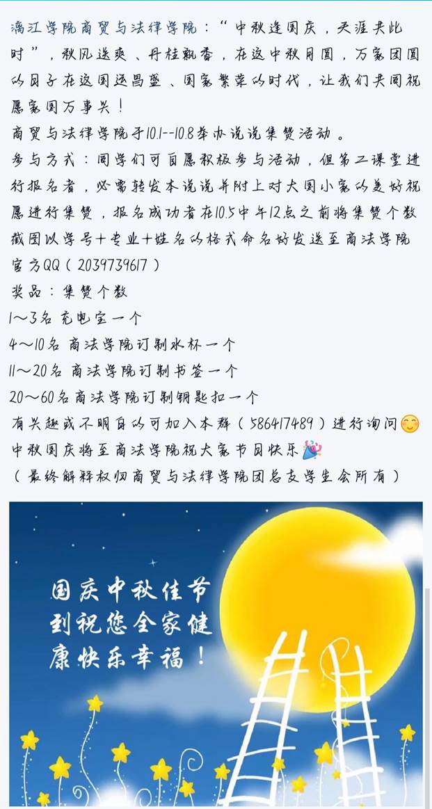 为了让同学们体验中国传统佳节的魅力,使同学们感受到家人般的温暖,商贸与法律学院于10.1--10.8举办说说集赞活动。活动主要在线上展开,同学们积极转发说说并附上对祖国的美好祝福。活动过程井然有序,同学们积极参加,工作人员耐心细致,活动顺利开展,同学们感受到了家国繁盛的欢乐与幸福,同时也陶冶了同学们之间家国情怀。
