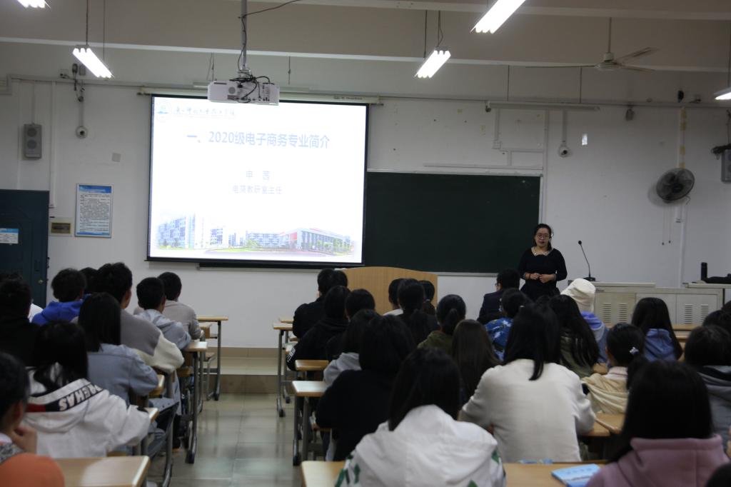 为加强2020级电子商务专业新生对本专业以及今后的大学生活的认识,同时也让新生能够更快的融入这个大家庭,我院于10月20日晚上19:10,在1309教室开展了电子商务专业新生见面会暨电商专业认知讲座。电子商务教研室主任申茜、专任教师张欣、浙江名淘控股程凤英、刘巨强老师以及2020级电子商务新生参加了此次见面会。