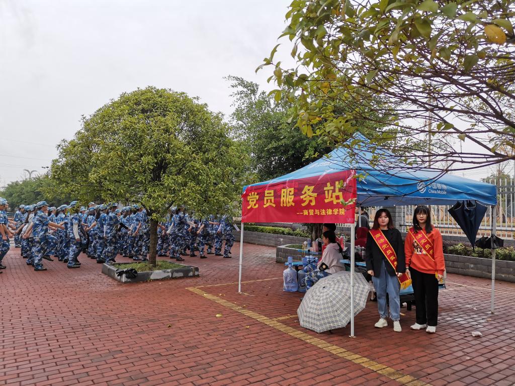 军训期间,为了弘扬“奉献、友爱、互助”的志愿精神,发挥“助人为乐,服务他人”的崇尚美德,商贸与法律学院党总支在漓院操场设立了军训党员服务站。从学生党支部中选拔了党员、积极分子作为党员服务站的志愿者,负责服务军训期间的教官和学生、引导各位新生尽快适应学校环境,完成各项准备工作,确保军训活动的有序进行。